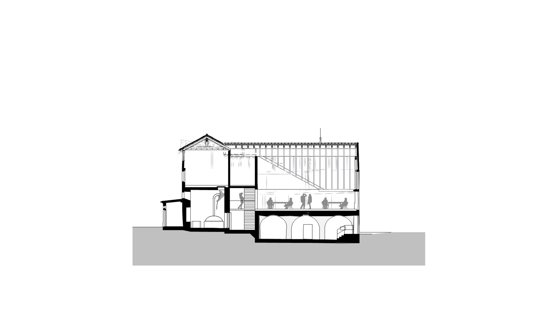 Erschließungstreppe und barrierefreier Aufzug liegen im Foyerneubau nahezu mittig im Gebäudeensemble. Von hier werden die Veranstaltungsräume im Gewölbekeller, sowie der große Saal im Dachgiebel erschlossen. Die unterschiedlichen Raumerlebnisse versprechen ein vielseitiges Angebot in stimmungsvoller Atmosphäre.