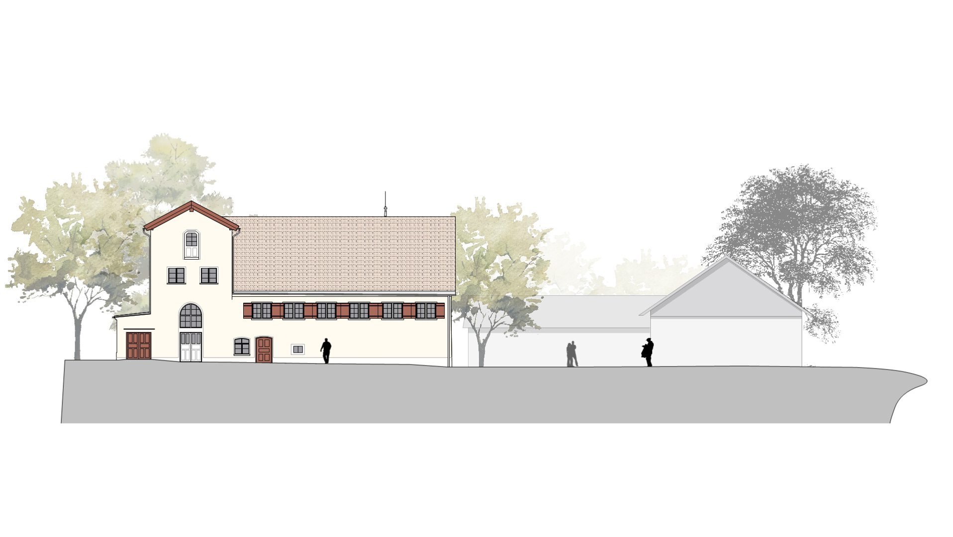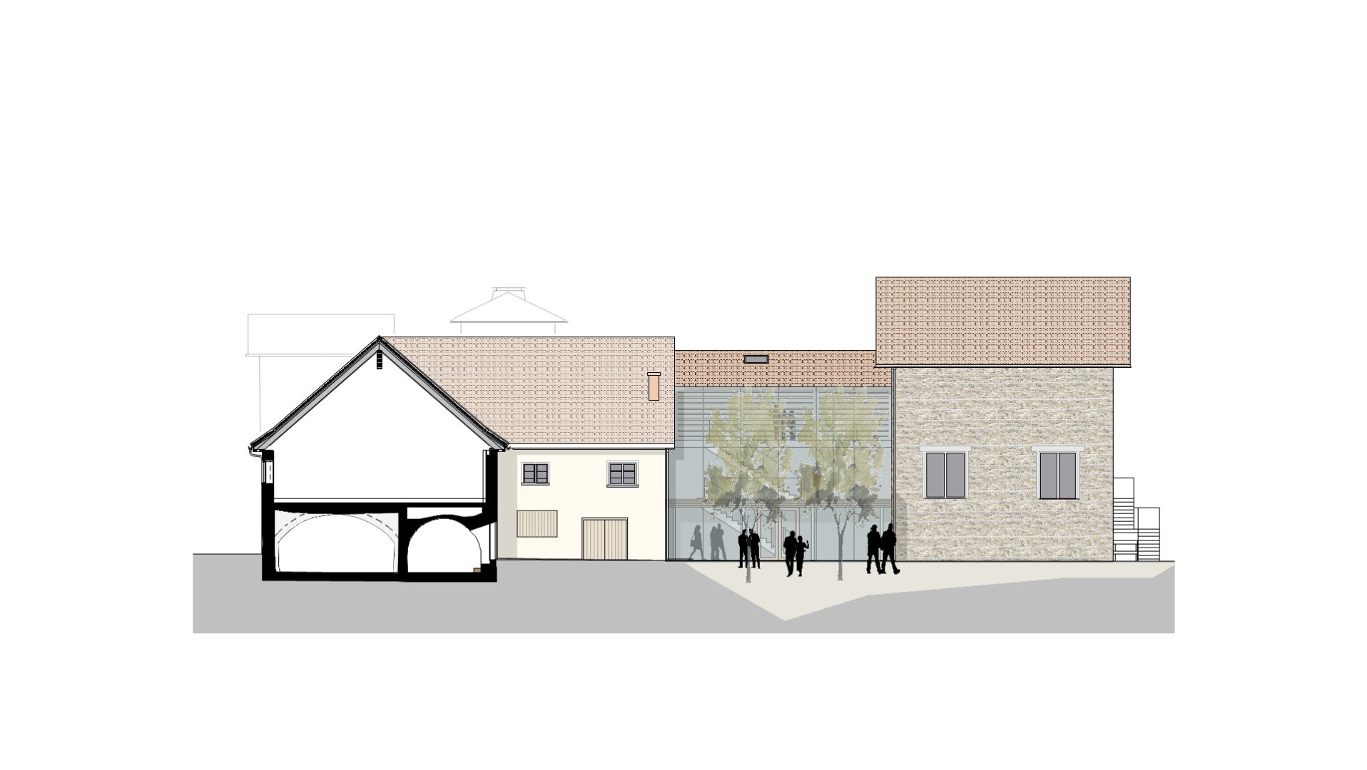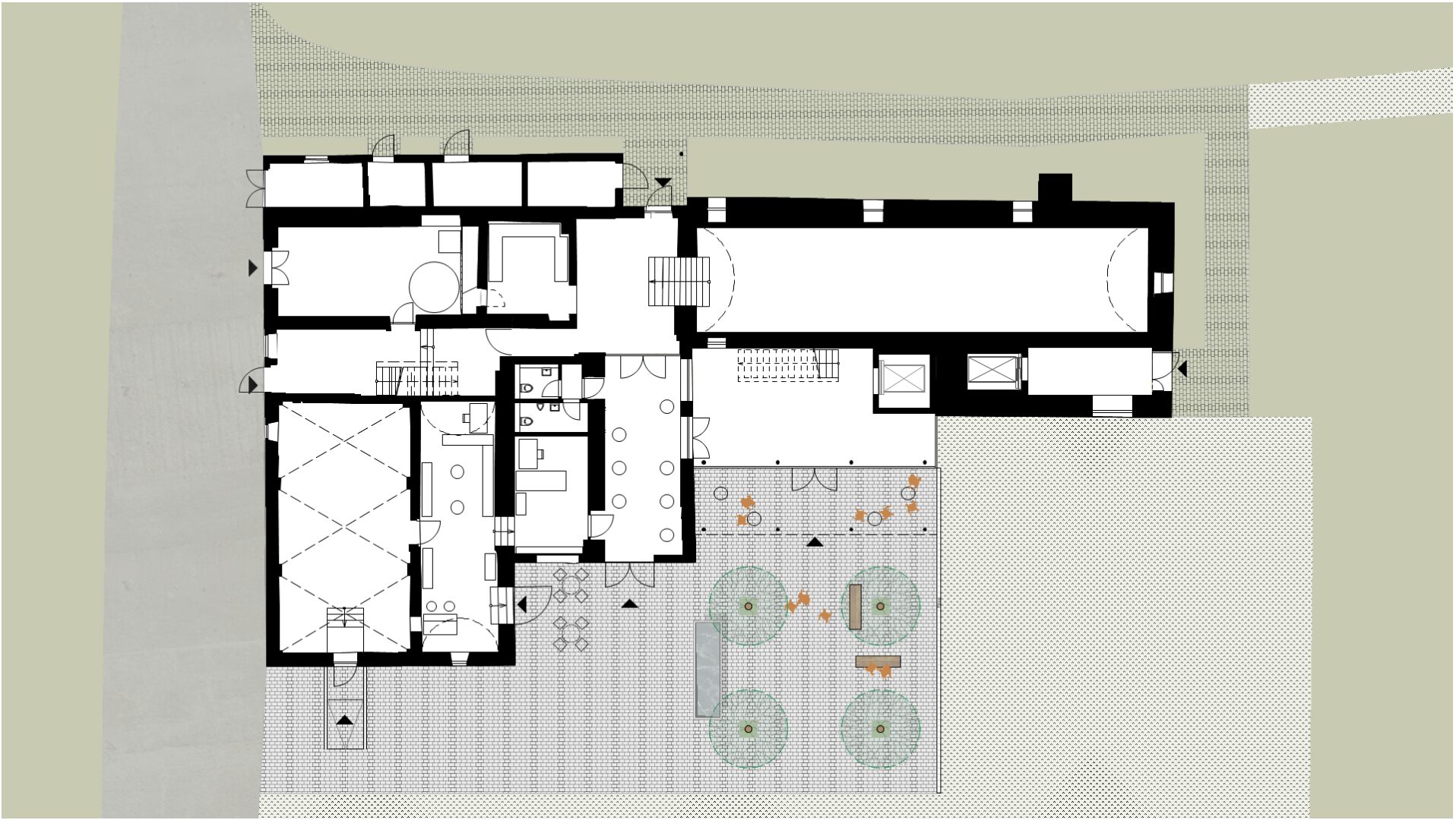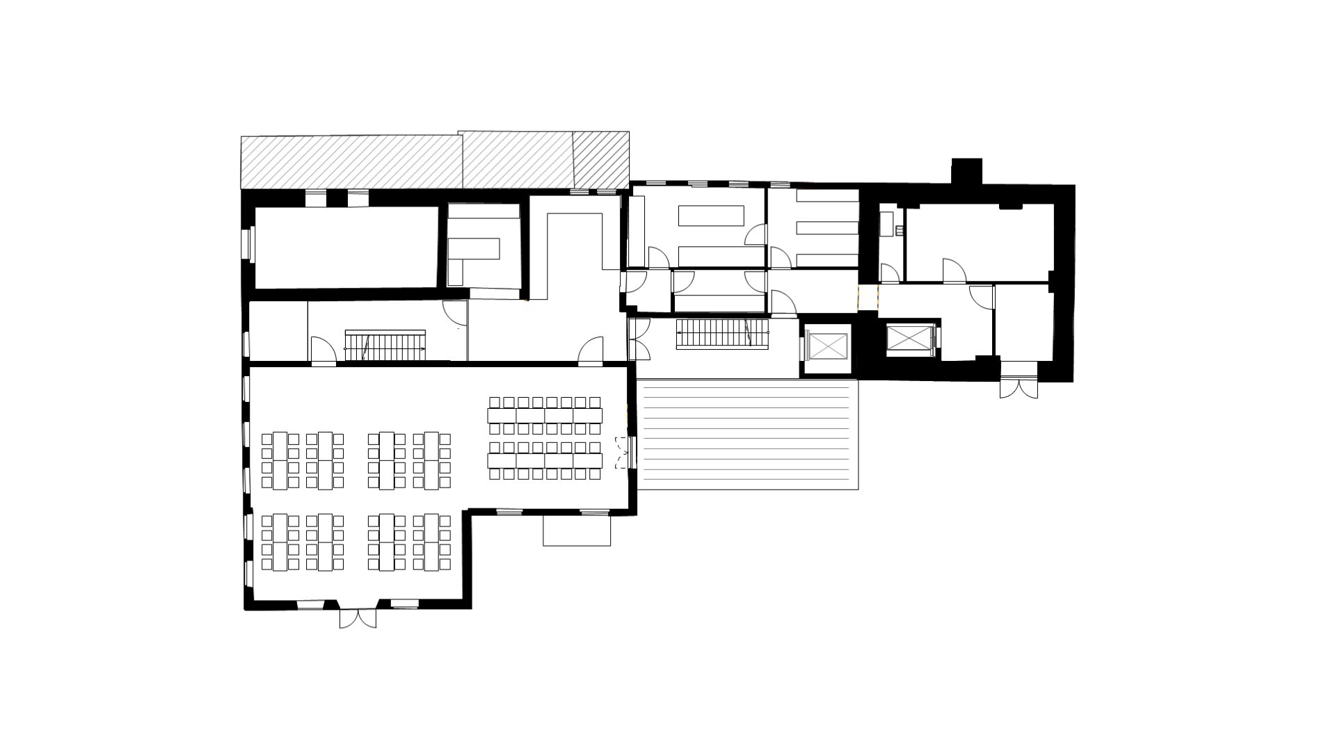 Erschließungstreppe und barrierefreier Aufzug liegen im Foyerneubau nahezu mittig im Gebäudeensemble. Von hier werden die Veranstaltungsräume im Gewölbekeller, sowie der große Saal im Dachgiebel erschlossen. Die unterschiedlichen Raumerlebnisse versprechen ein vielseitiges Angebot in stimmungsvoller Atmosphäre.