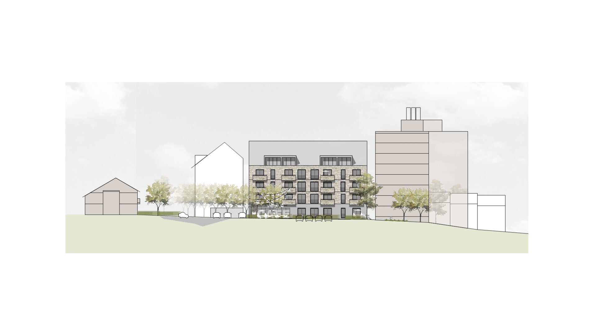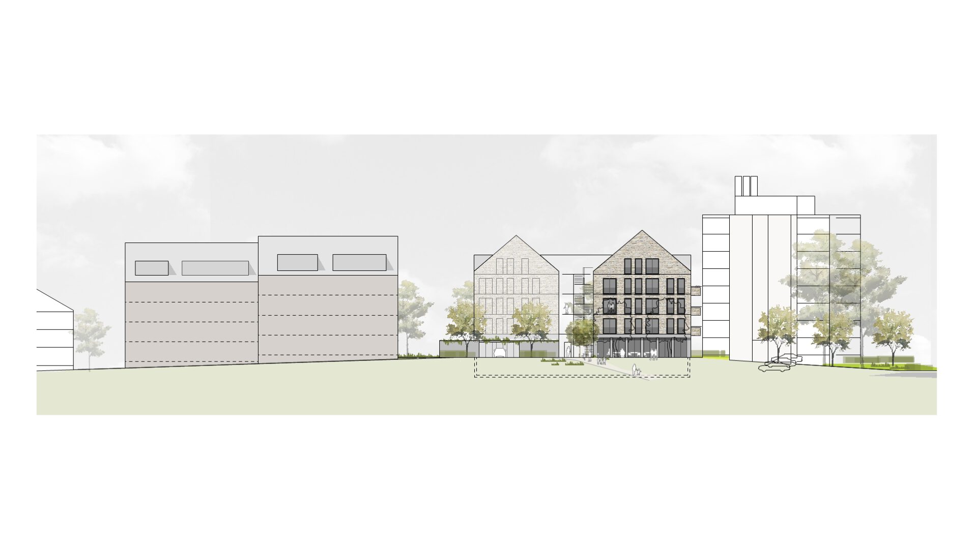 bebauung auf und führen die städtebauliche Setzung der Nachbargebäude konsequent fort: Von Ansicht Karmeliterstraße werden die Hausköpfe der Nachbarbebauung um zwei zusätzliche Giebelseiten ergänzt.