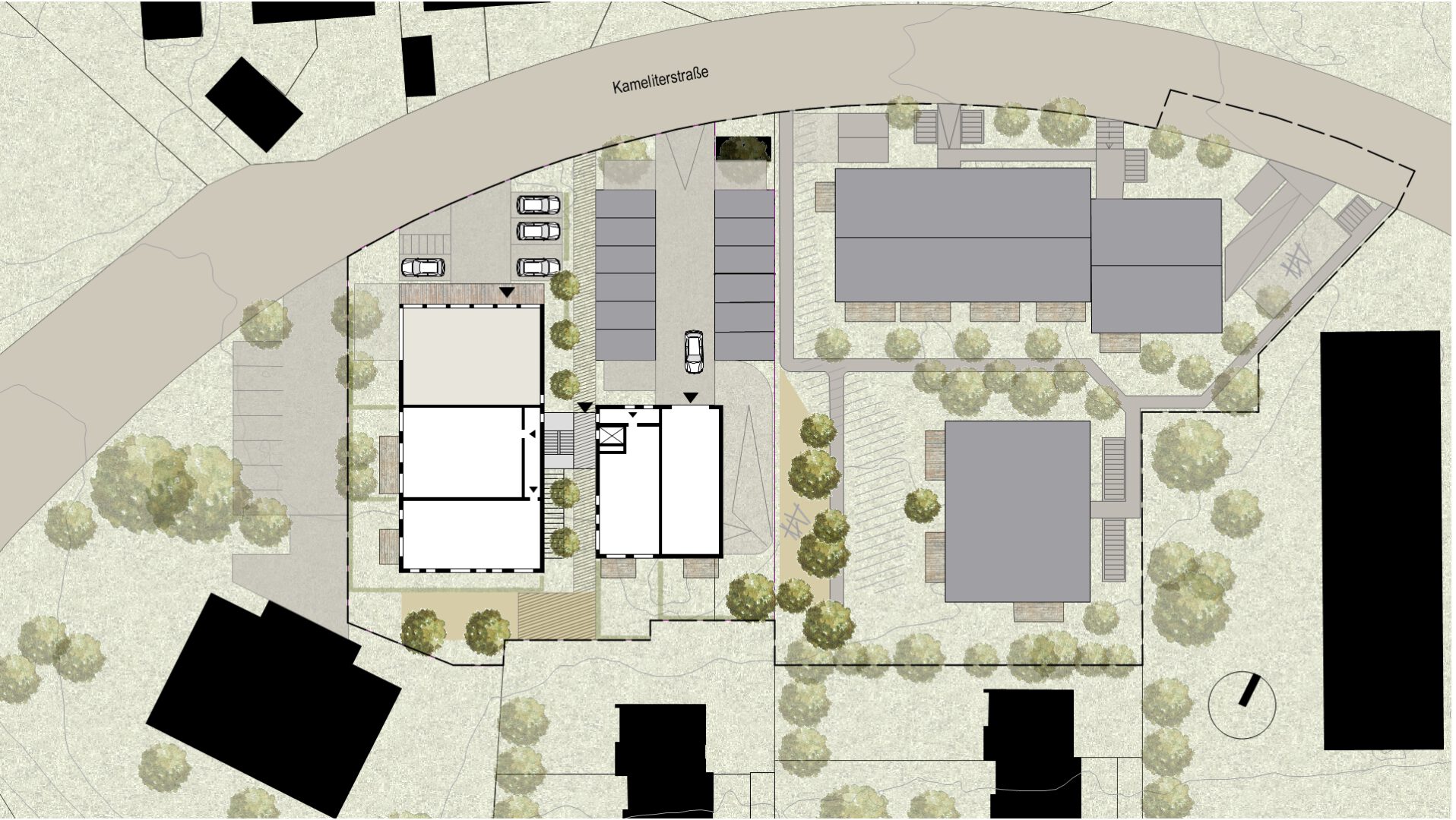 Zwei klar gefasste Gebäudevolumen greifen die Körnung der Umgebungs-